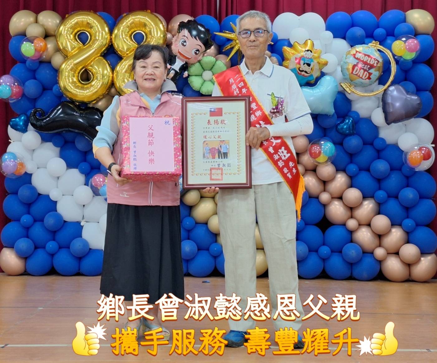 鄉長曾淑懿強調,孝親不能等,行孝要及時,壽豐鄉公所雖然財源拮据,在鄉民代表會支持下,提高重陽敬老禮金,讓長輩感受到鄉公所與代表會對長者的關懷,鄉公所也會用心擴展地方產業、農業,鼓勵子女回鄉創業或就業陪伴雙親。